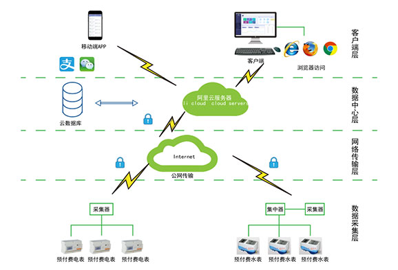 對于分布不同省、地市或同地市不同區域的連鎖商業、集團、百貨、門店、物業、院校等業務分散,要求集中管理、線上支付,低額提醒、欠費告警。但常規的本地插卡付費、本地預付費并不能完全滿足客戶管理需求,預付費云平臺應運而生。AcrelCloud-3200水電預付費云平臺無縫集成商業、物業公司、集團企業、院校等分散布置的安科瑞DDSY/ADF系列電子式預付費電能表、閥控智能水表等,提供微信、支付寶、銀聯等可選的在線支付方式,大大方便了用戶充值、圈存,提供預警和充值、退費、電能消耗等記錄查詢,方便用戶和管理方的數據統計和財務分析,提供先交費后使用的管控機制,大大降低了管理部門的收費成本。